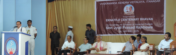 This is another tribute to Mananeeya Eknathji in the form of a magnificent hall at VKV Itanagar. The construction of the Bhavan started on 9th November 2013 with the Vastupooja wherein Man. Balakrishnanji and Dr. Joram Begiji were present. The hall was inaugurated by His Excellency Governor, Sri Jyoti Prasad Rajkhowa in the presence of Dr. Joram Begiji & Mananeeya Bhanudasji on 16th July 2015. The band troops of Banderdewa & Itanagar, the women cultural troops of Chimpu village lead by Smt. Biri Yalik, hundreds of parents of Itanagar, Vivek Vihar and students of Itanagar added to the grandeur of the Programme.