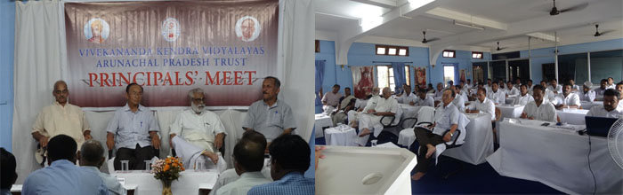 The three sessions on ‘March Forward’ taken by Mananeeya Balakrishnanji and D. Bhanudasji were very much insightful and were studded with the strong ideals of Vivekananda Kendra. Leading purposeful life with Tyaga and Seva as the basic principles with selfless attitude, Systematic approach in all our endeavors, purity of life, Importance of Organizational life, Transparency in our monetary dealings, Teaching of Values to the children, Need of strong spiritual philosophy in life etc were the main topics covered in ‘March Forward’. Principals Meeting took the stock of the activities conducted in the last session in order to make the activities more effective. In addition to these, there were sessions by Dr. Joram Begiji on ‘Educational Needs of Arunachal Pradesh and Our responsibility’, session by Sri Dipok Kumar Borthakur, Trustee, Sri Pravinji on the celebration of Mananeeya Eknathji Janma Shati Parva etc. There were also open discussions on various topics like Higher Academic Result-Why and How, Quality inputs – Hindrances and opportunities in Elementary School Education, Admission Policy, Reporting –Some stumbling Blocks. The result of the last Class X and XII batches were analyzed and targets were set. The various activities to be conducted in the session were also discussed.
