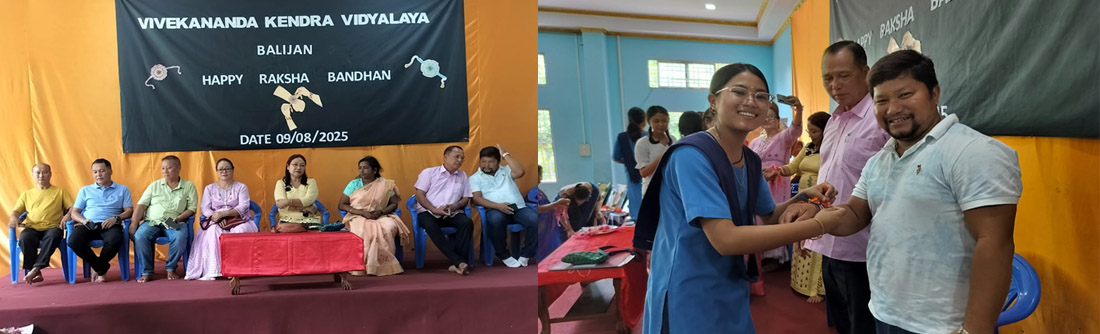 On 9th August 2025, VKV Balijan celebrated the occasion with great joy and enthusiasm. The program started with the lighting of the lamp by ZPM Smt. Tem Pika followed by an invocation. SSG members and 4 Sankal pramukhs were also present. Then Principal VKV BALIJAN formally welcomed everyone. Principal, SSG members, all teaching and non-teaching staff, Sankul Pramukhs, Gana Pramukhs, and Saha Gana Pramukhs, along with family and students offering the Rakhi to Om, Ramakrishna, Maa Sarada, and Swamiji. After offering the Rakhi to Om, Ramakrishna, Maa Sarada, and Swamiji, all SSG members, Sankul Pramukhs, Students, Teachers, Gana Pramukhs, and Saha Gana Pramukhs also tied Rakhi to each other. The importance of the day was well described by Chulvi Nalo, a student of Class IX. Sri. Nabam Hachang, sir, an active member of the SSG group, delivered an important speech of celebration of Rakhi. He also emphasised the importance of bonding between the students of our school especially the hostellers.