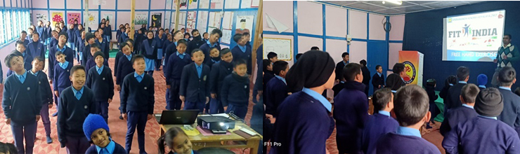 3. Students of Class IV, VI, VII and IX were assembled in the Hall and were briefed about the importance of exercises for maintaining good health and how it builds immunity to protect us from various diseases. After that a brief warming up session was demonstrated where the students were taught a few free hand exercises to strengthen large and small muscles of our body. Children were told how movements like jumping; squatting, bending, swinging etc. helps us to increase strength, fitness and flexibility of our body. They were advised to follow these set of exercises regularly to achieve a fit and healthy body.